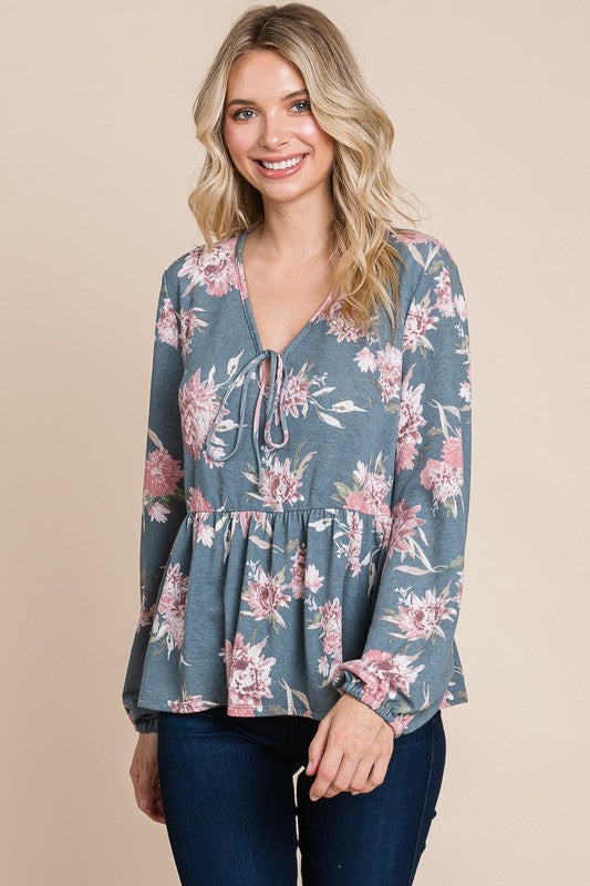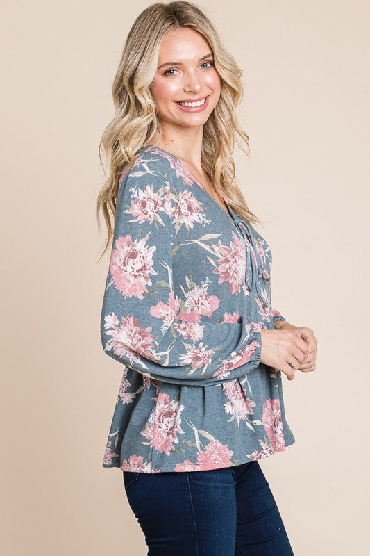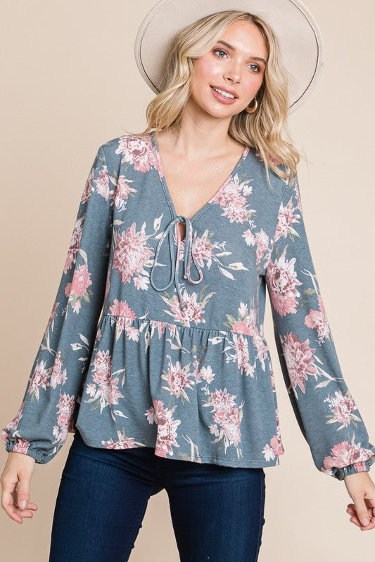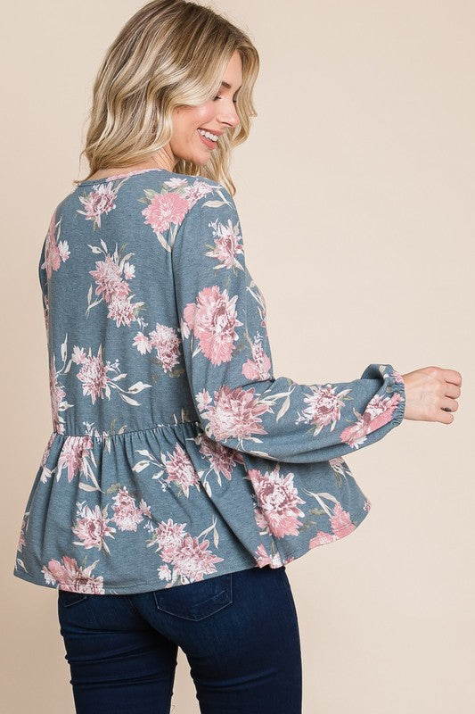 Super Lady Full Size Babydoll Floral Long Sleeve Blouse